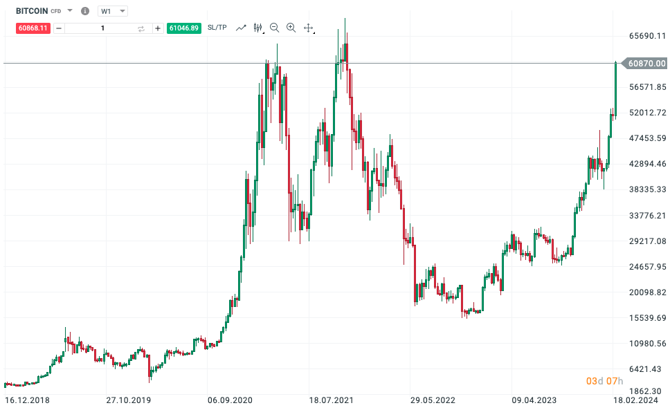 V priebehu stredy cena Bitcoinu prekonala psychologickú hranicu 60 000 dolárov. Ide o najvyššiu hodnotu od novembra 2021 a najznámejšiu kryptomenu delí od historických maxím iba 14 %. Od začiatku roka vzrástla cena Bitcoinu o viac ako 43 % a ani po minuloročnom 167 % náraste nevykazuje známky spomalenia. Čo však stojí za pokračujúcim rastovým trendom?
