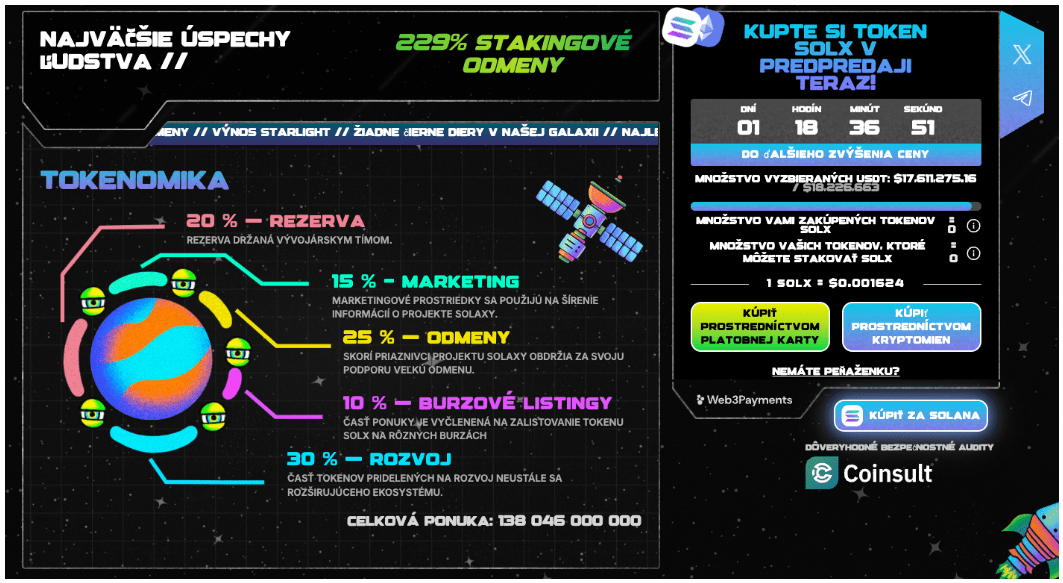 Vlastnosti projektu Solaxy oslovili investorov natoľko, že predpredaj v čase písania článku prekročil hranicu 17,6 miliónov dolárov. Tokeny SOLX si môžete doplniť jednoduchou výmenou za USDT, BNB, ETH alebo platobnou kartou. Hodnota natívnych tokenov sa však každou predpredajnou fázou zvyšuje.