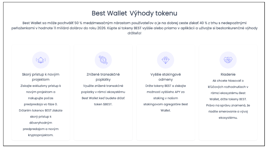 Súčasťou ekosystému Best Wallet je aj natívny token BEST. Jeho držitelia získavajú exkluzívne výhody ako napríklad: