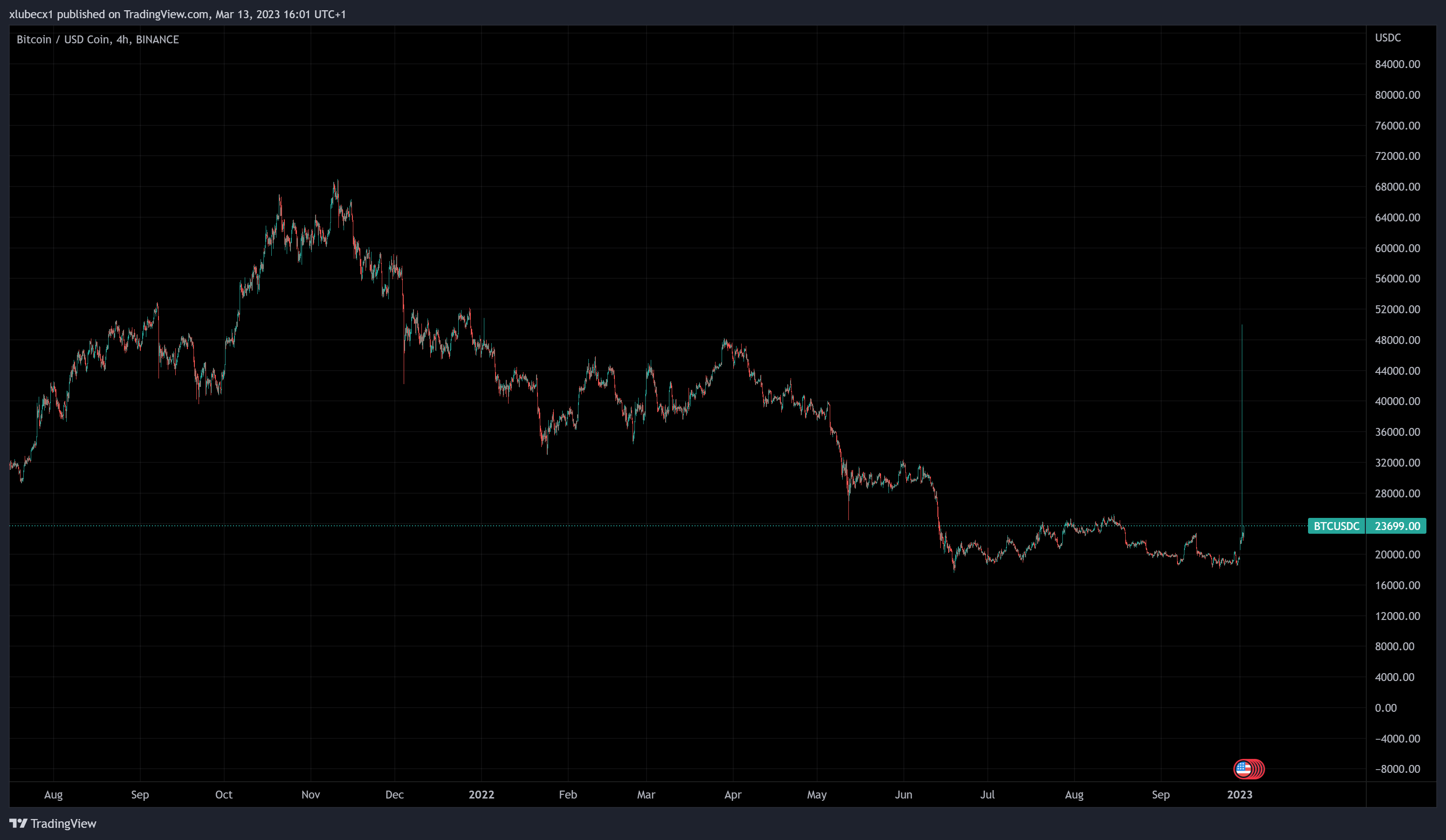 Cena ako rýchlo vyrástla, tak sa aj vrátila na pôvodné hodnoty. Pohyb s veľkou pravdepodobnosťou nemá súvis s problémami stablecoinu USDC. Príčinou čiastočne môže byť víkendové vypnutie obchodovania. V dôsledku toho na trhu poklesla likvidita. Opačný pohyb bitcoinu na 42 centov, takzvaný flash crash nastal napríklad aj v roku 2019 na burze OKX.