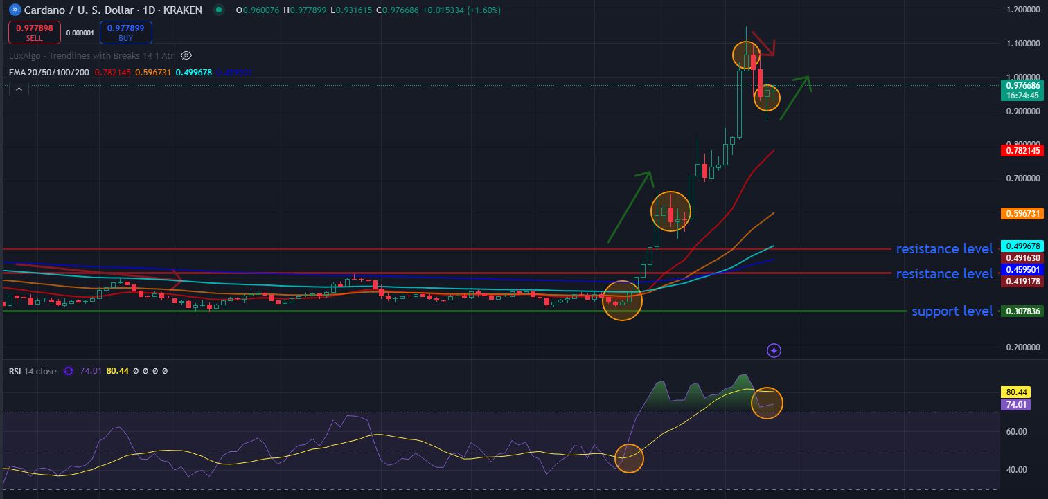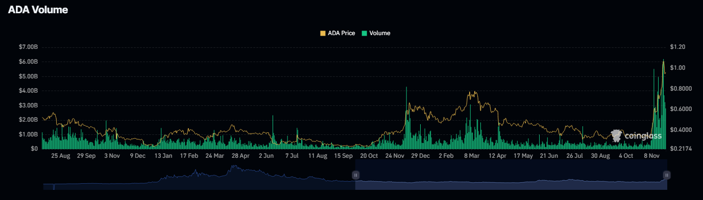 Momentálne sa ADA predáva za 0,9711 dolára. Za posledných 30 dní jeho cena vzrástla o pôsobivých 191,6 %. Tento rýchly rast, spolu s jeho 10-dňovým kĺzavým priemerom 0,9077 dolára, ukazuje, že záujem o túto kryptomenu rastie.