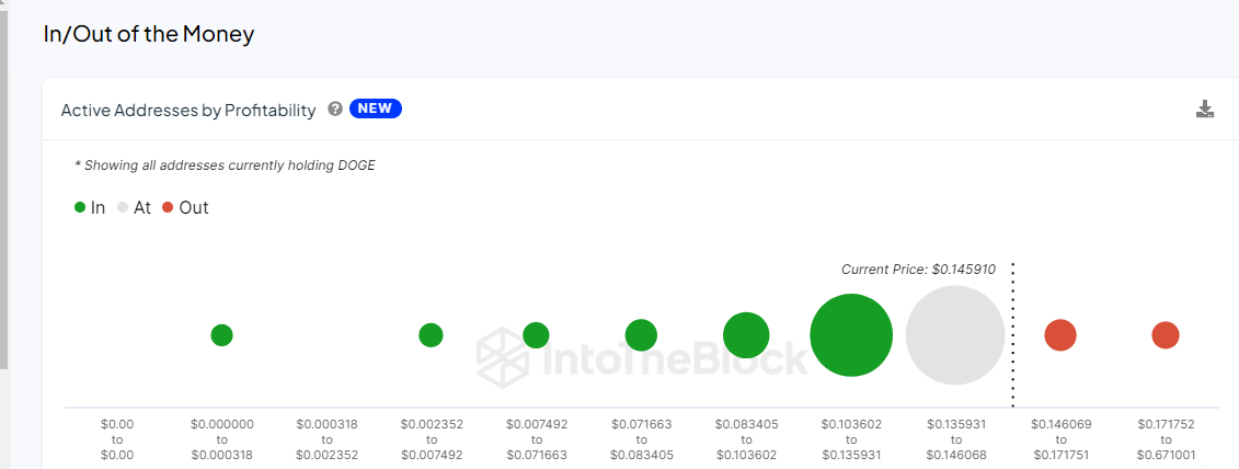Podľa indikátora Global In/Out of the Money od IntoTheBlock je 80 % objemu Dogecoinu v zisku, čo znamená, že nákupná cena je pod súčasnou cenou. Aktuálny rozsah prostriedkov je 0,1359-0,1460 dolárov.