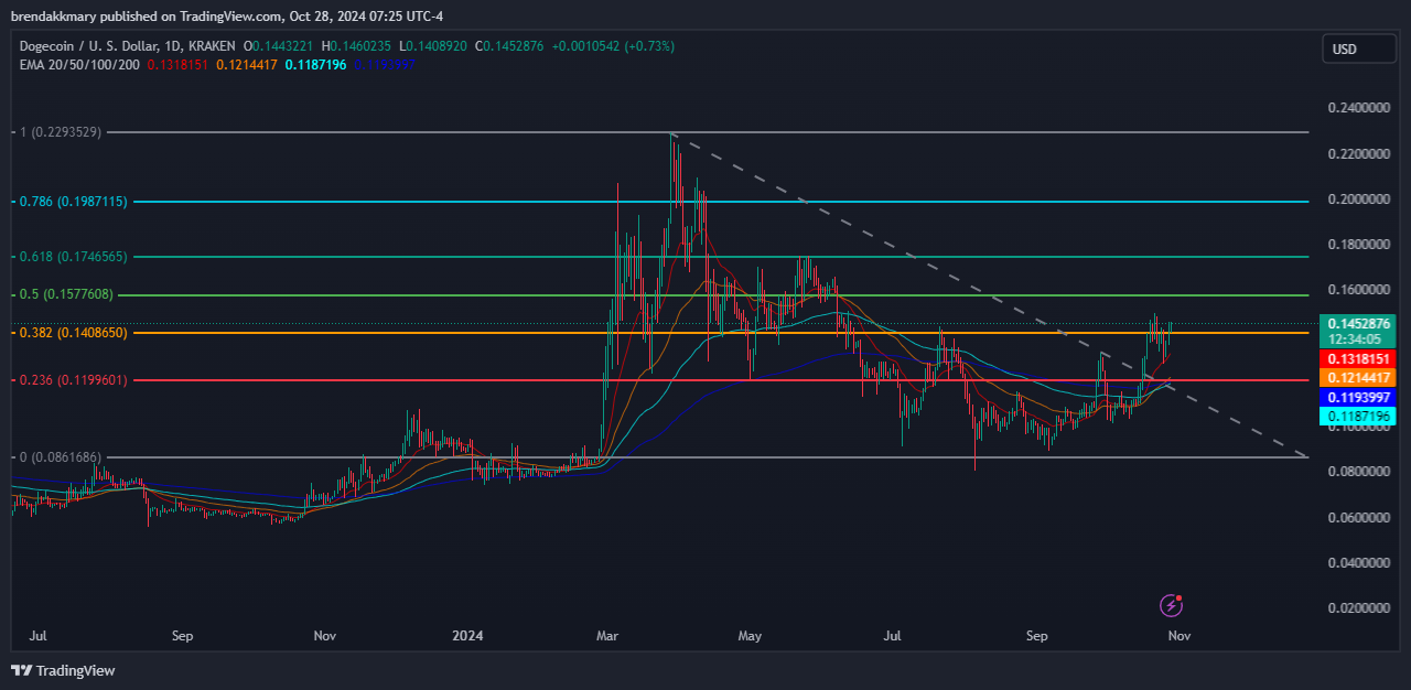 Cenový pohyb Dogecoinu ukazuje sľubný rastový vzor, ktorý sa momentálne zastavil tesne pod psychologickou hranicou 0,15 dolárov. Táto zastávka nasleduje po dynamickom raste spustenom prelomením klesajúceho klinového vzoru, ktorý vyvrcholil zlatým prekrížením medzi 50-dňovým a 200-dňovým exponenciálnym kĺzavým priemerom (EMA). Toto prekríženie často signalizuje potenciálny dlhodobý býčí momentum, čo naznačuje, že Dogecoin by sa mohol pripravovať na výraznejší rast.