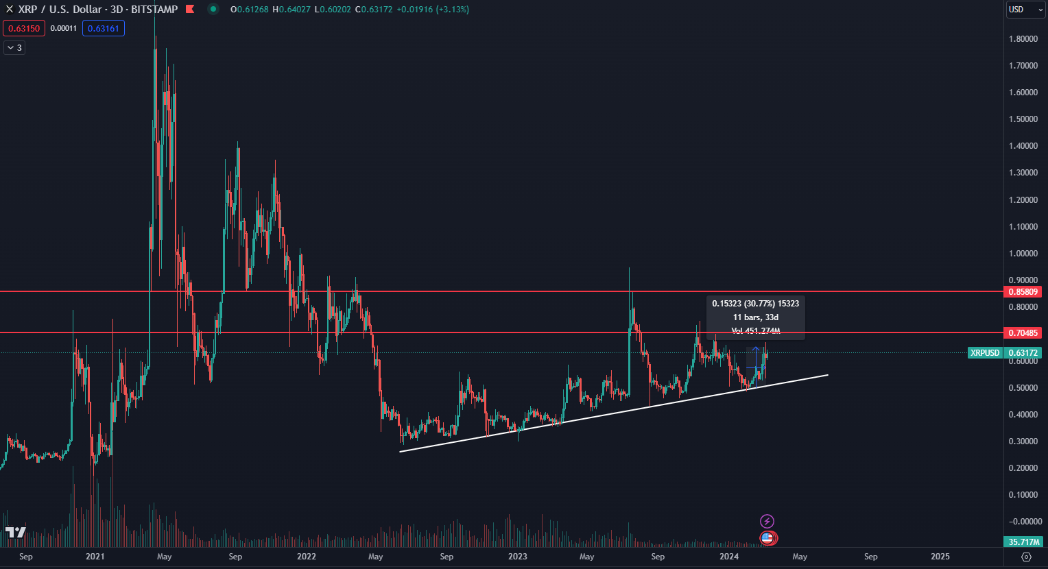 Inak tomu nie je ani posledné týždne. Od začiatku februára cena stúpla len o 30 %. Len pre porovnanie, Bitcoin stúpol o 64 %, Ethereum o 74 %, Solana o 58 %, Cardano o 66 % a Binance coin o 61 %. Všetko sú to najviac kapitalizované mince, za ktorými XRP nestíha, pričom patrí medzi nich.