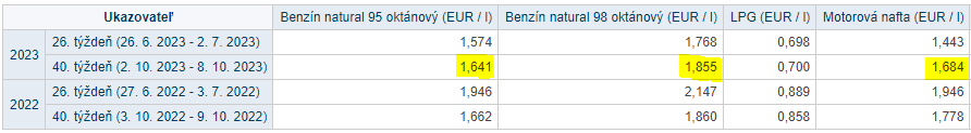 • Benzín natural 98 oktánový – 1,855 eur/l