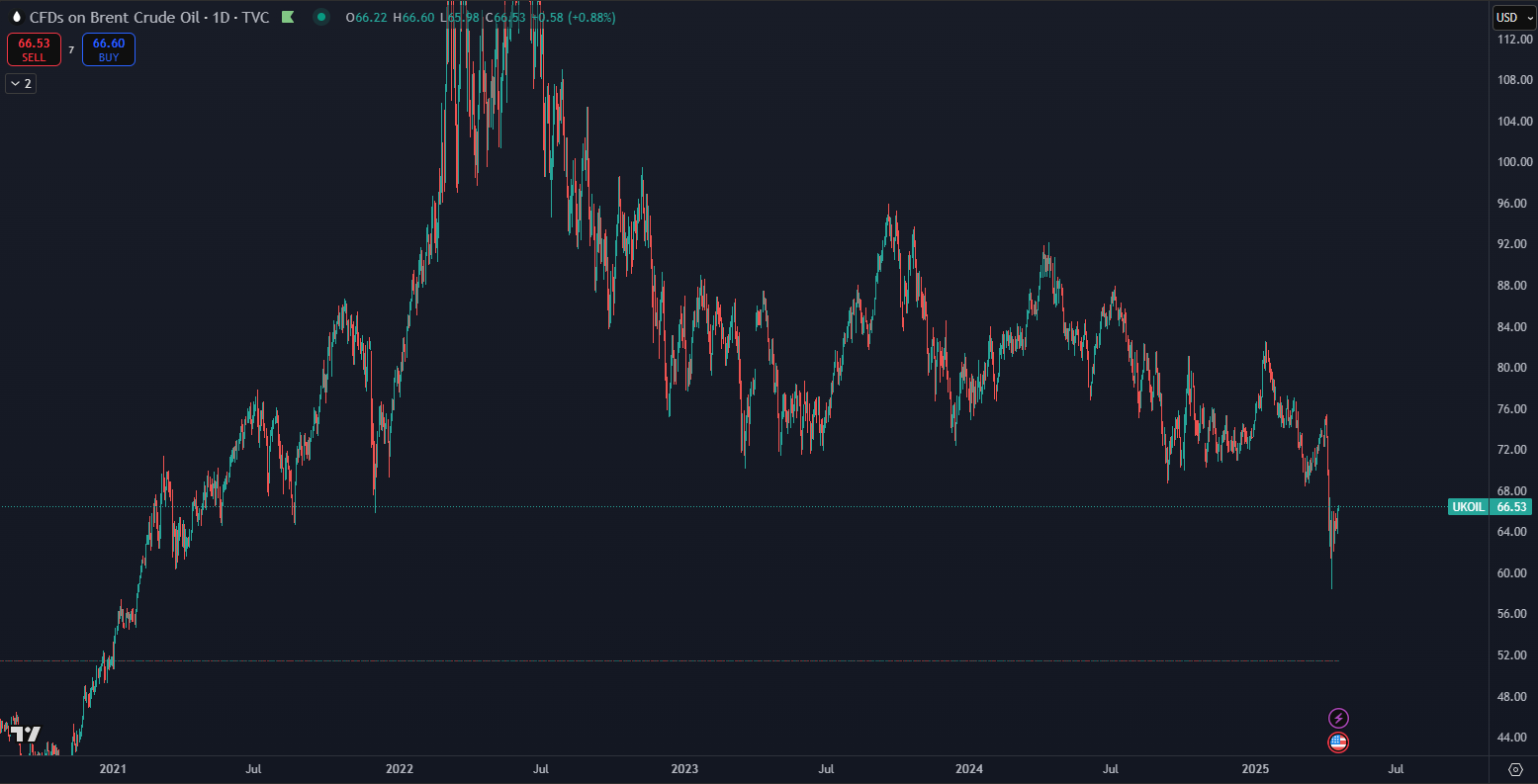 Cena ropy Brent zaznamenala 9. apríla 2025 výrazný pokles na úroveň 58,44 dolárov za barel, čo sme naposledy videli vo februári 2021. Ako ukazujú údaje Tradingview, ide o 4-ročné minimum, pričom v roku 2025 došlo k celkovému poklesu o 12,46 % a medziročne až o 23,70 %. Oproti maximu z marca 2022 ide o prepad o dramatických 51,86 %.