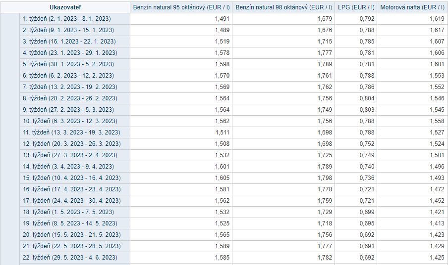 V čase písania článku sa na Slovensku tankuje benzín a nafta za nasledujúce ceny. Aktuálne k 22. týždňu: