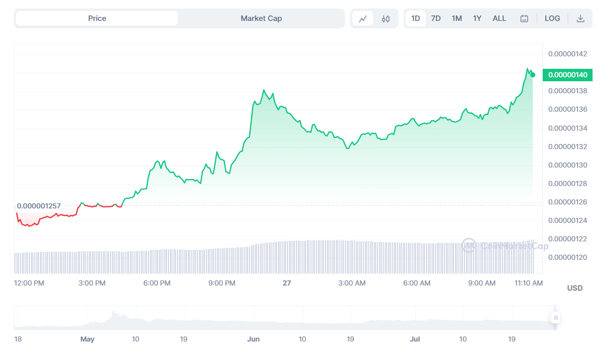 Po dramatickom poklese o 15 % od pondelku sa Pepe momentálne obchoduje za 0,000001398 $ (čo predstavuje nárast o 11,22 % za posledných 24 hodín).