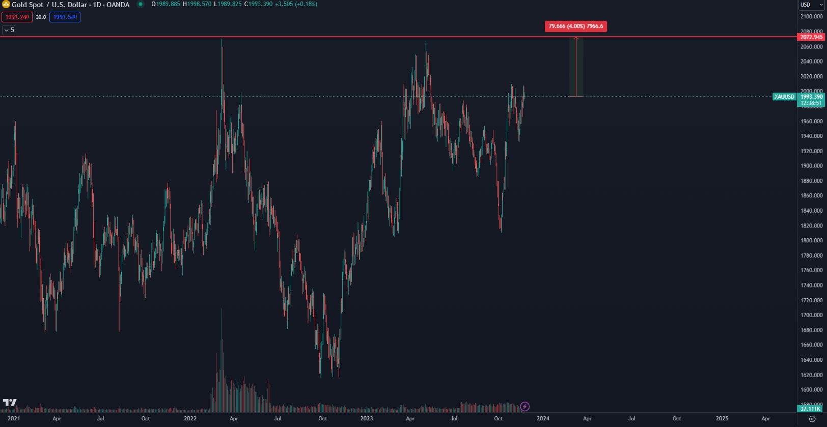 V súčasnosti sa nachádza najvyššie dosiahnutá cena zlata na úrovni 2 075 dolárov z augusta 2020. Následne cena na túto úroveň narazila ešte v marci 2022 a máji 2023. Z technického hľadiska sa tak na cenovom grafe vytvoril trojitý vrchol, ktorý reprezentuje kľúčovú rezistenciu.