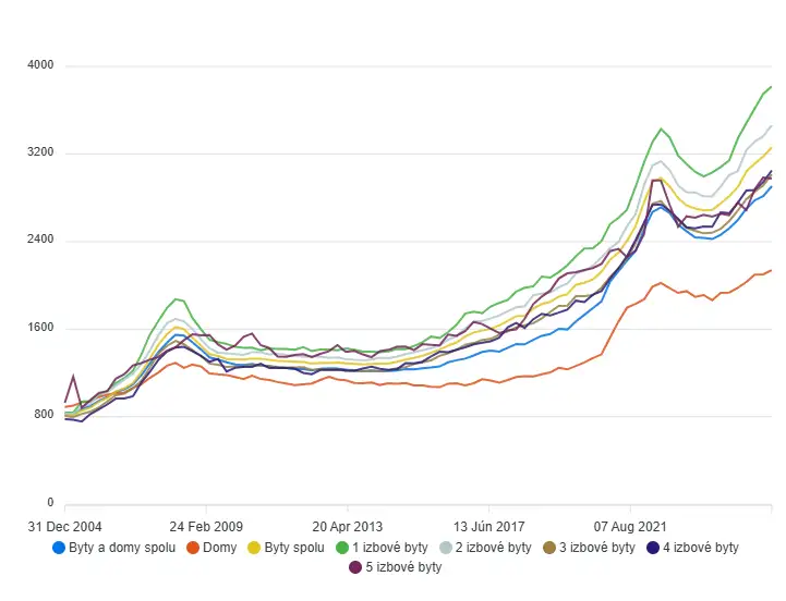 Dlhodobý graf od roku 2004 jasne ukazuje, že súčasná situácia nie je len dočasným výkyvom. Krivky všetkých typov nehnuteľností prudko smerujú nahor a prekonávajú dokonca aj realitnú bublinu z obdobia pred rokom 2009. Rozdiel medzi cenami bytov a domov sa neustále zväčšuje, čo signalizuje, že mestské bývanie sa stáva luxusom.