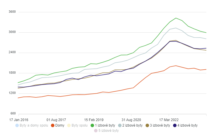 Na základe údajov NBS, ceny 4-izbových a 5-izbchých bytov spoločne s domami začali medzikvartálne rásť prvýkrát od druhého kvartálu 2022. Naopak 1-izbové, 2-izbové a 3-izbové byty pokračovali v miernom poklese. Aj pri nich ale jasne vidieť, že tempo znižovania cien výrazne spomalilo.
