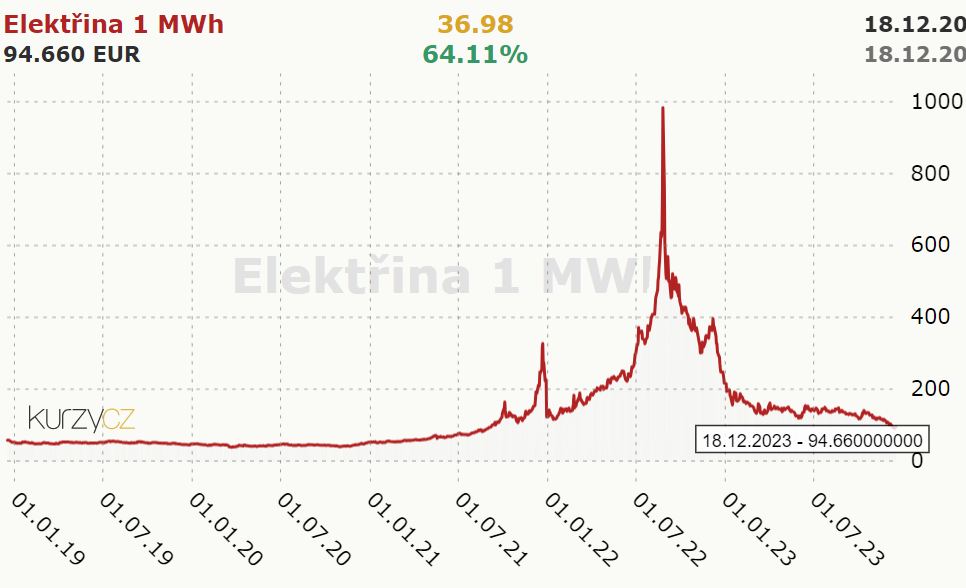 V čase písania článku ku dňu 18. decembra je trhová cena za elektrinu podľa údajov Kurzy.cz 94,66 eur za megawatthodinu (MWh). Trhová cena plynu taktiež dlhodobo klesá a obchoduje sa na úrovni 39,26 eur za MWh. Pre porovnanie, ceny dosiahli vrchol 26. augusta 2022 v prípade elektriny na úrovni 984 eur za MWh a v prípade plynu 317,51 eur za MWh. Súčasné ceny sú tak skoro 10-krát nižšie.