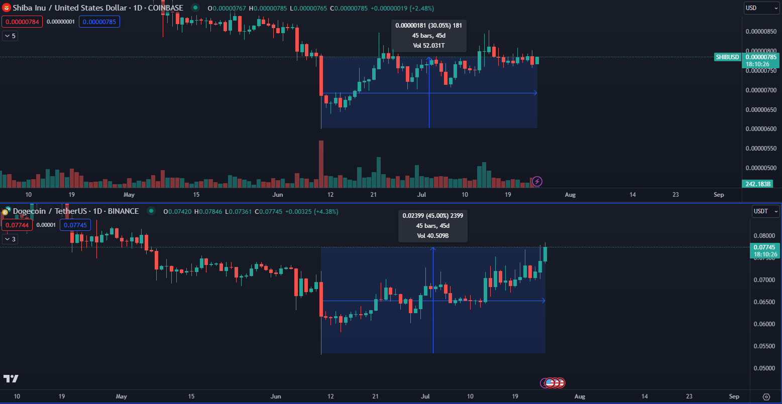 V tom istom čase Shiba Inu s trhovým podielom 28 % zaznamenala zhodnotenie iba 1 %. Spolu s Dogecoinom predstavujú až viac ako 90 % segmentu. Keď však budeme analyzovať trh nie za posledných 30 dní, ale od posledného minima z 10. júna zistíme, že obe kryptomeny prudko narástli. V tomto období totiž Dogecoin stúpol o 45 % a Shiba Inu o 30 %, ako vidíme na grafe nižšie.
