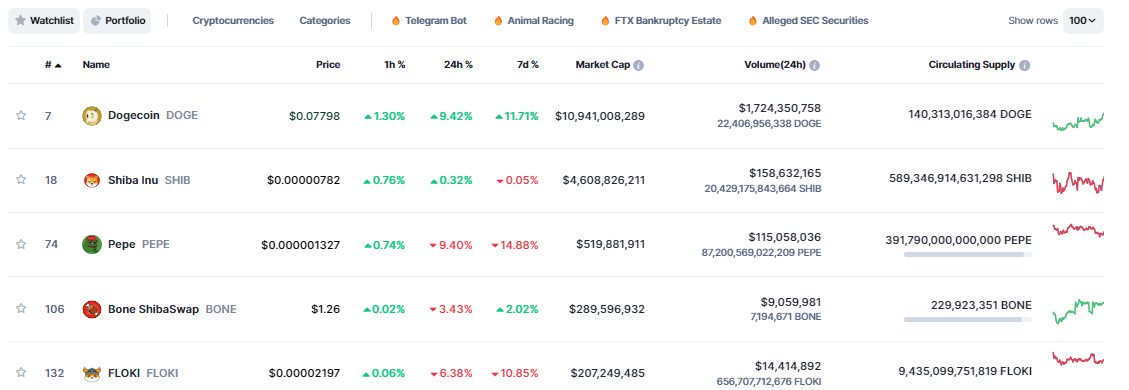 Podľa rebríčka CoinMarketCap na základe trhovej kapitalizácie sú toto v čase písania článku najväčšie meme coiny: