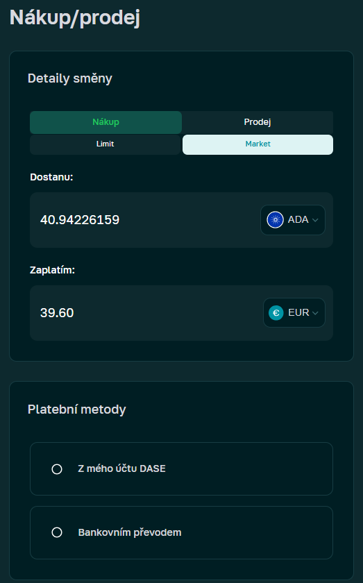 Výhodou zmenárne DASE je, že máte na výber dva základné obchodné prístupy. Buď to realizujete jednoduché zamieňanie cez nákup a predaj, alebo môžete využívať pokročilé obchodné metódy cez burzové rozhranie.