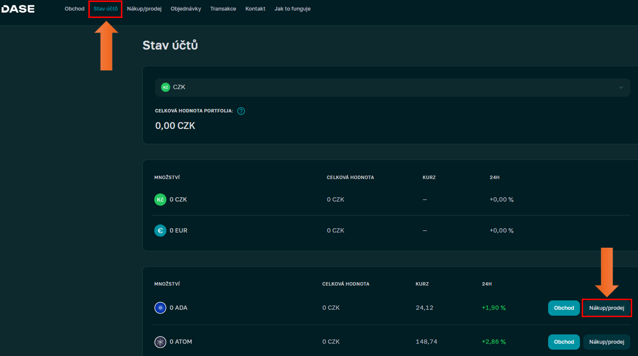 Na kryptomenovej burze DASE máte k dispozícii svoju vlastnú peňaženku, do ktorej sa dostanete cez hlavné menu prostredníctvom možnosti Stav účtu. Priamo v peňaženke môžete realizovať nákup a predaj. Teraz si ukážeme ako na to.