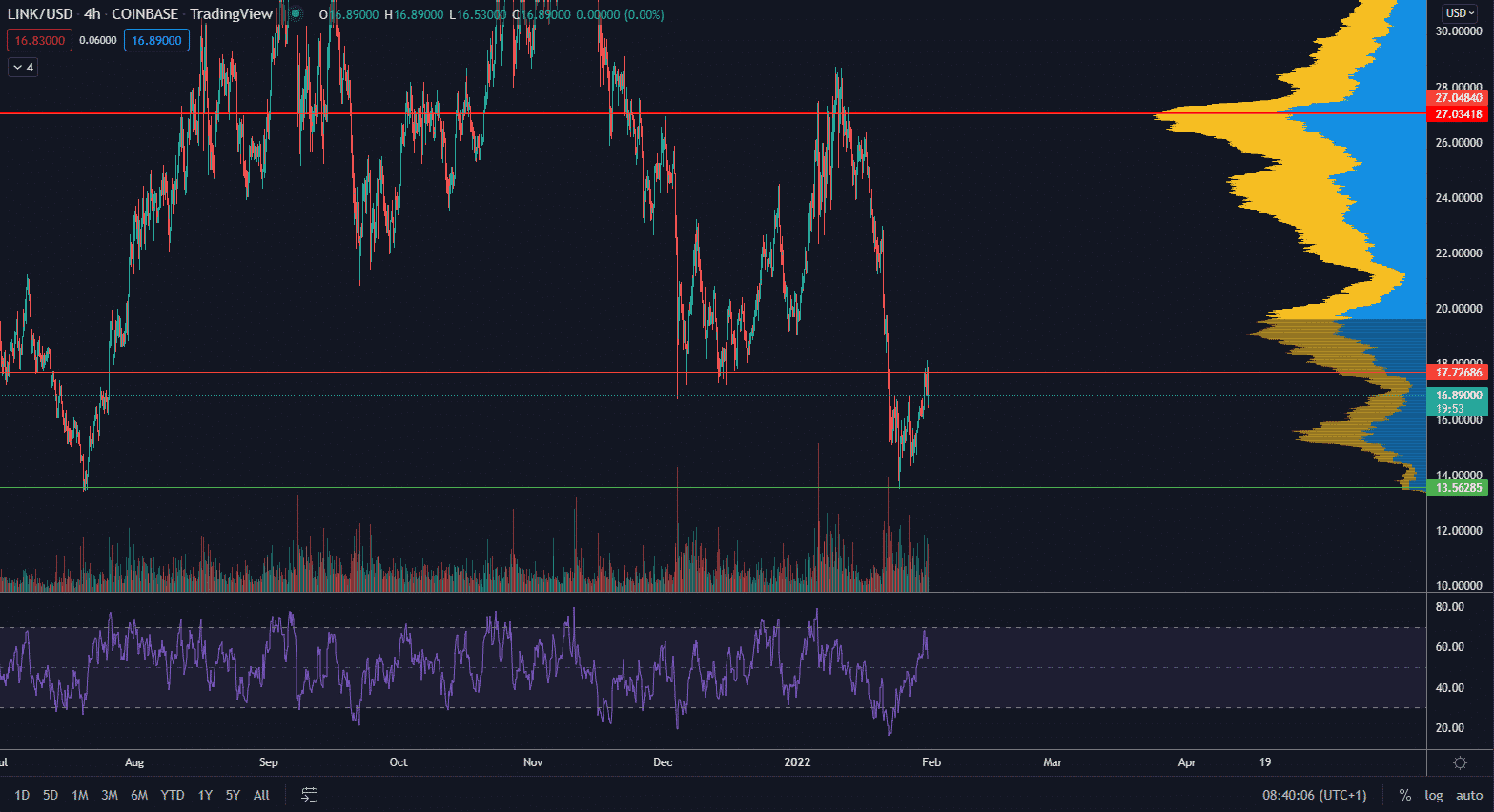 Chainlink mal slušný retracement v porovnaní s ostatnými highcapovými coinami. Napriek tomu cena narazila na rezistenciu a cena krátkodobo opäť padá. Kľúčové preto bude vytvorenie ďalšieho lokálneho minima, ktoré by sa malo sformovať vyššie ako to predošlé. Či sa to cene naozaj podarí, uvidíme časom.