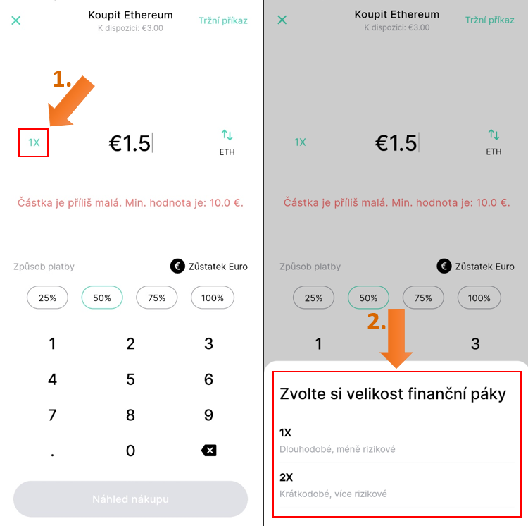 Finančná páka znamená, že si požičiate peniaze, aby ste zvýšili potenciál zisku. Ide o obchodovanie, ktoré obchodníkom umožňuje požičiavať si cudzie prostriedky za úrok a maximalizovať svoj potenciálny zisk. Ako môžete vidieť, v našom príklade pri kúpe Etherea si môžeme zvoliť finančnú páku 1X a 2X.