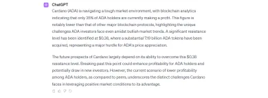 ChatGPT predpovedá, že budúcnosť ADA závisí od jeho schopnosti prelomiť úroveň odporu 0,38 dolára. Úspešné prekonanie tejto bariéry by mohlo viesť k zvýšeniu ziskovosti držiteľov a potenciálne prilákať ďalších investorov. Súčasná nízka ziskovosť držiteľov v porovnaní s inými protokolmi však naznačuje, že Cardano čelí jedinečným výzvam pri využívaní priaznivých trhových podmienok.