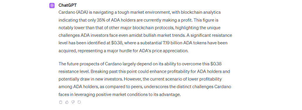 ChatGPT odhaľuje, že Cardano v súčasnosti čelí náročnej situácii na trhu, ako odhalila blockchainová analýza. Iba 35 % držiteľov je v zisku, čo je v ostrom kontraste s ostatnými poprednými blockchainovými protokolmi. To naznačuje potenciálne výzvy pre investorov, a to aj napriek nedávnym rastovým trhovým trendom.