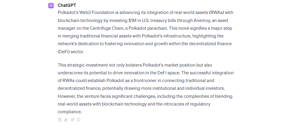Podľa ChatGPT by úspešná realizácia tejto stratégie mohla Polkadot postaviť do pozície lídra v oblasti prepájania tradičného financovania a decentralizovaného financovania, čo by mohlo prilákať viac inštitucionálnych a individuálnych investorov. Zložitosť spojená s integráciou reálnych aktív s technológiou blockchain a navigáciou v regulačnom prostredí však predstavuje značné výzvy.