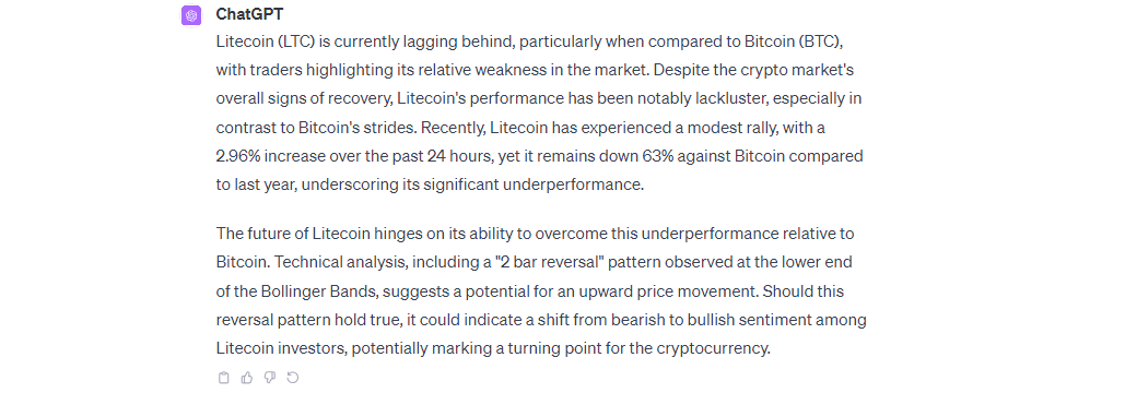 Podľa ChatGPT Litecoin v súčasnosti zažíva fázu slabšej výkonnosti, najmä v porovnaní s Bitcoinom. Obchodníci poukázali na relatívnu slabosť LTC na trhu. Napriek tomu, že celkový trh s kryptomenami vykazuje známky oživenia, jeho výkonnosť zostáva v porovnaní s Bitcoinom nevýrazná.