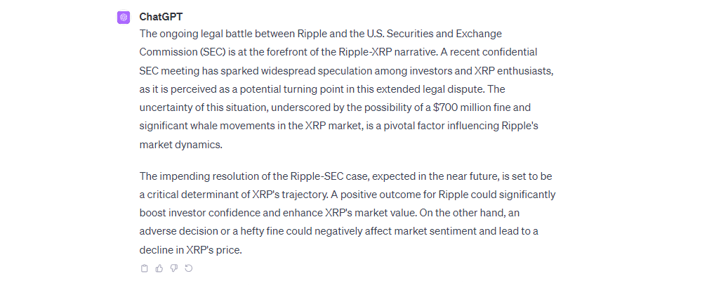 Ako analyzuje ChatGPT, prostrediu Ripple v súčasnosti dominuje jeho prebiehajúca právna bitka s americkou Komisiou pre cenné papiere a burzy (SEC). Nedávne dôverné stretnutie SEC, ako uvádza ChatGPT, podnietilo intenzívne špekulácie medzi investormi a stúpencami XRP. Toto stretnutie, hoci oficiálne nesúvisí s prípadom Ripple, sa považuje za potenciálny bod obratu vo vlečúcej sa právnej ságe medzi Ripple a SEC.