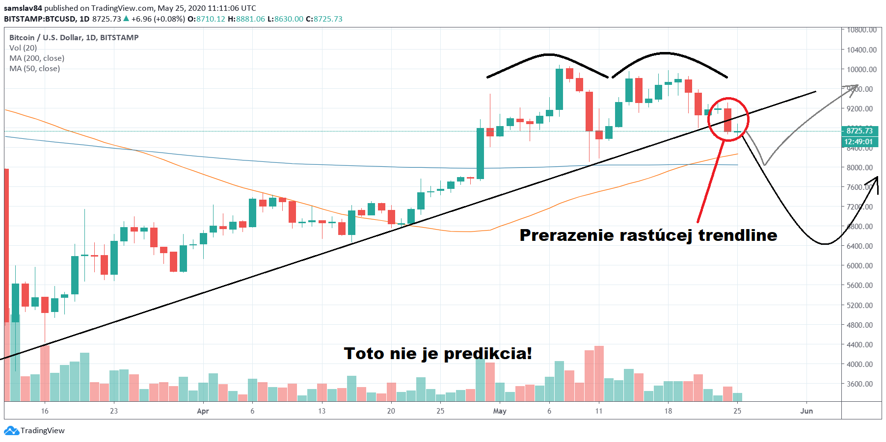 Ako môžete vidieť na ilustračnom grafe, stúpajúca trendline, ktorú Bitcoin sledoval v posledných dvoch mesiacoch bola včerajšou sviecou prerazená. To naznačuje možnú rotáciu na trhu a začiatok korekcie.