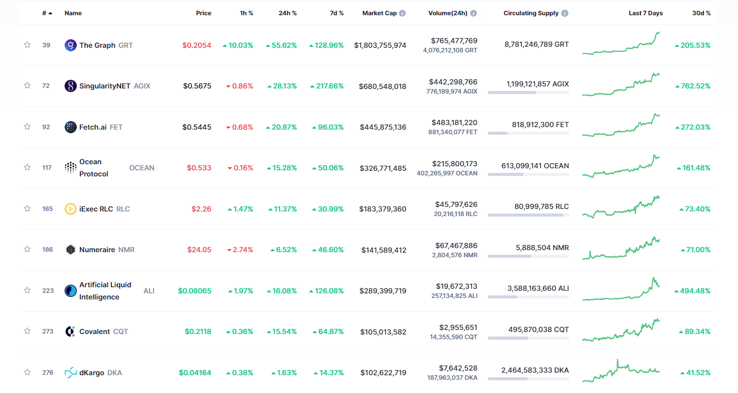 Rast AI kryptomien. Zdroj: coinmarketcap.com
