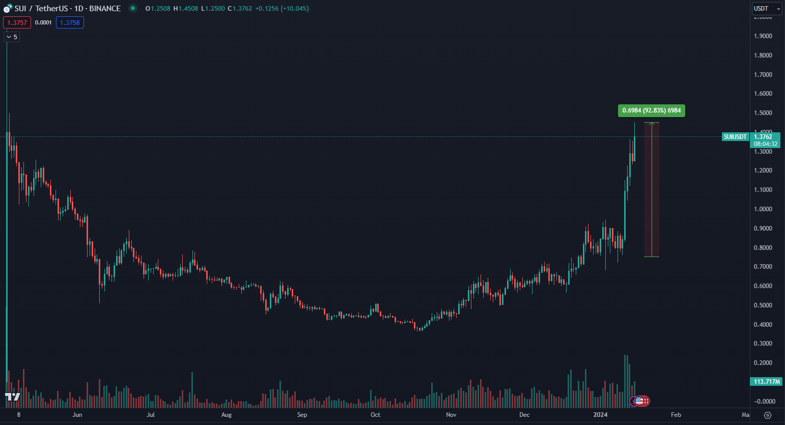 Na grafe nižšie vidíme, že cena SUI stúpla v čase písania článku za posledný týždeň o takmer 100 %. Minimum bolo dosiahnuté ešte 20. októbra 2023 na cenovej úrovni 0,36 dolára a odvtedy sme boli svedkami nárastu až o 300 % v najvyššom bode 1,45 dolára z dňa 15. januára 2024. Naposledy sa cena obchodovala na rovnakej úrovni začiatkom mája 2023 bezprostredne po spustení ICO v apríli.