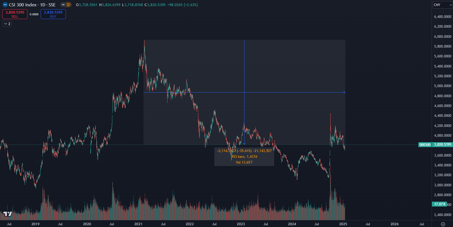 Napriek tomu, že čínska vláda sa snaží o stimuly, výnosy vládnych dlhopisov Číny sú na historických minimách a akciový index CSI 300 sa obchoduje o 35 % nižšie v porovnaní so svojim maximom z roku 2021, ukazujú údaje TradingView.