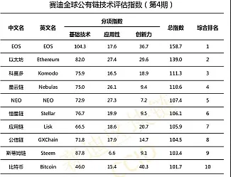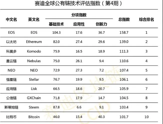 Na základe vyššie uvedených kritérií zaradil v júli CCID Bitcoin až na sedemnástu priečku. Teraz sa vyšvihol na desiate miesto, predovšetkým vďaka vyššiemu zisku bodov z kategórií technológia a inovácia. Napriek tomu sú blockchainy projektov Komodo, Nebulas, NEO, Stellar, Lisk, GXChain a Steem umiestnené ešte vyššie ako Bitcoin, nakoľko tvorcovia indexu u nich vidia vyššiu mieru využiteľnosti či vyšší technologický prínos.