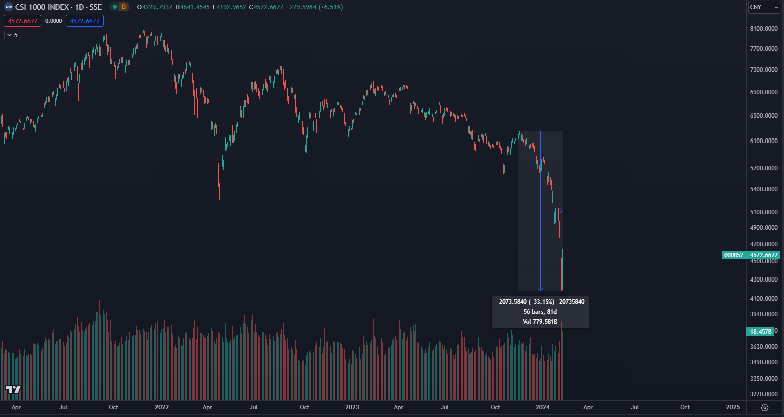 Čínsky index obchodovaný na burze CSI 1000 vytvoril za posledných 80 dní znehodnotenie až o 33 %, čo je extrémne číslo a pripomína skôr korekciu kryptomien. Len počas 5. februára klesol o 8,7 % a následne došlo k miernemu zotaveniu.