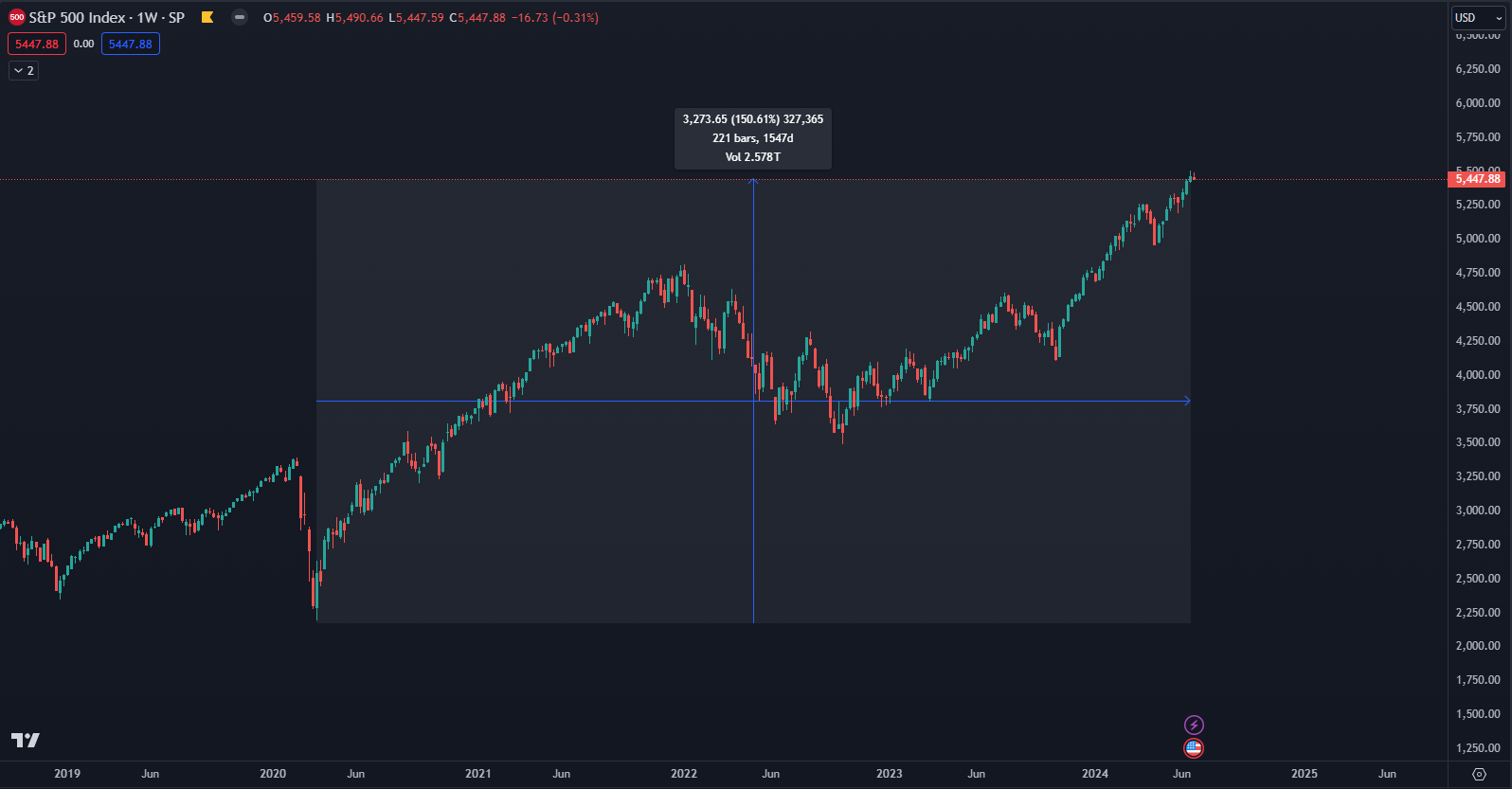 V tejto kapitole si budeme analyzovať zhodnotenie investície za posledné 4 roky. Budeme si ilustrovať scenár, kedy ste nakúpili index S&P 500 jednorazovo na trhovom minime v marci 2020, kedy začala globálna Covid pandémia. V tom čase totiž ceny zaznamenali výrazný cenový pokles.