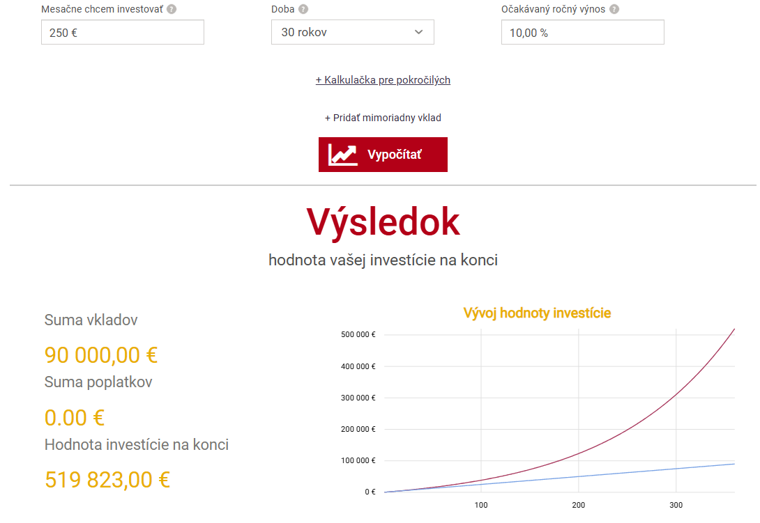 Investujeme 250 eur mesačne po dobu 30 rokov. Zdroj: financnykompas.sk