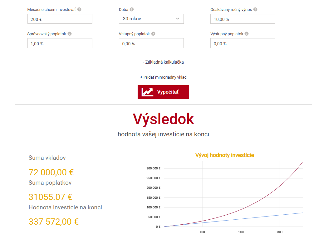 Ročný správcovský poplatok patrí medzi najdrahšie náklady pre investora. Predstavte si, že investujete 200 eur mesačne po dobu 30 rokov s očakávaným ročným výnosom 10 %.