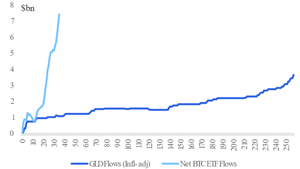 Ak sa bavíme o ETF na zlato, je potrebné uviesť, že patria k historicky najúspešnejším ETF fondom vôbec. Nie je to teda porovnávanie neporovnateľného. Spotové ETF na Bitcoin ich však prekonalo, dalo by sa povedať až zahanbilo. Zlatému ETF fondu SPDR Gold Shares (GLD) spusteného v roku 2004 trvalo celé dva roky dostať sa na úroveň 10 miliárd kapitalizácie.