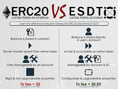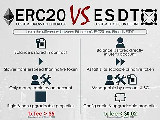 Takisto už sú hotové aj smart kontrakty, ktoré uzrú svetlo sveta s nadchádzajúcou aktualizáciou siete Elrond. Smart kontrakty hrajú vo svete kryptomien pomerne významnú rolu. Prvou kryptomenou, ktorá poskytovala smart kontrakty a ERC20 štandard je Ethereum. Na obrázku nižšie môžete vidieť porovnanie Ethereum ERC20 a Elrond ESDT.