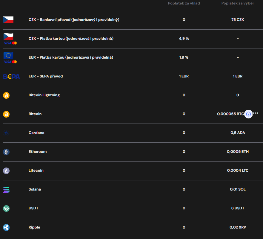 Druhou veľkou skupinou poplatkov na Coinmate sú poplatky za vklady a výbery. Tabuľka nižšie zobrazuje jednotlivé sadzby podľa toho, akú menu používate. V prípade SEPA prevodu je poplatok 1 euro pri výbere aj vklade. Pri kryptomenách sa za vklad neúčtuje nič, za výber je sadzba premenlivá.