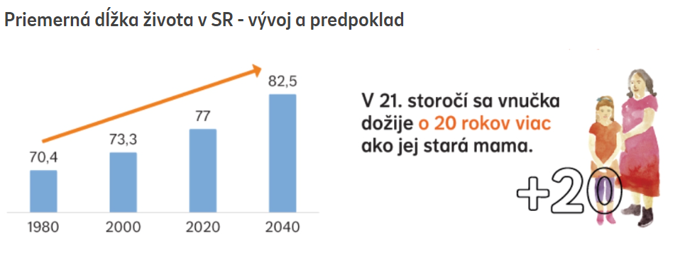 Predpokladaná priemerná dĺžka života Slovákov je na úrovni 78 rokov. Čo sa týka finančného zabezpečenia, očakávania Slovákov sú na chvoste Európy. Naša spokojnosť s finančnou situáciou je podpriemerná, pričom až 60 % tvrdí, že sa zhoršuje. Štvrtina občanov žije od výplaty do výplaty a 15 % ide od mínusu. Viac ako polovica verí, že budú pracovať aj počas dôchodku.