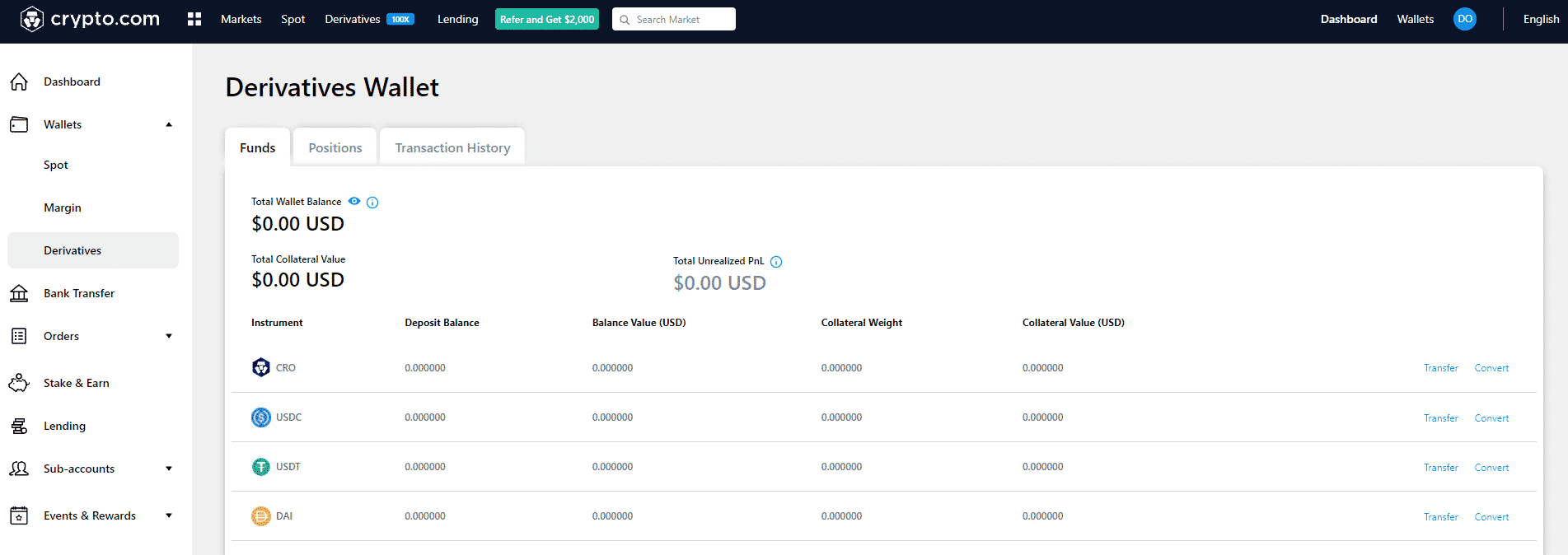 - Convert – konvertovanie kryptomien v rámci derivátovej peňaženky