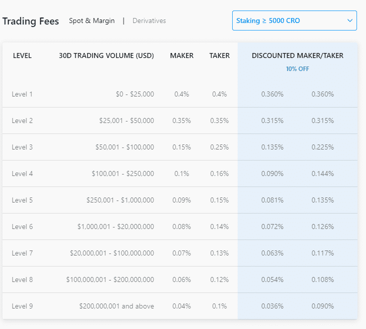 Už na začiatku recenzie sme si povedali, že jednou z najväčších nevýhod burzy Crypto.com je zložitá štruktúra poplatkov pri obchodovaní s kryptomenami. Tak ako pri mnohých burzách, aj v tomto prípade sa poplatky rozdeľujú na základe toho, či ste v danom obchode príjemca (taker) alebo tvorca (maker). Nasledujúca tabuľka poskytuje lepší prehľad o aktuálnych poplatkoch tvorcu a príjemcu.