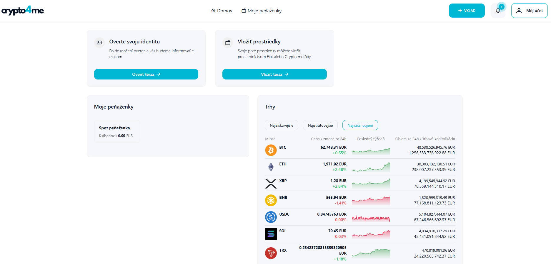Rozhranie platformy crypto4me vyniká čistým, minimalistickým dizajnom, ktorý neodvádza pozornosť od toho podstatného – vašich investícií. V ľavej časti nájdete sekciu Moje peňaženky, kde máte okamžitý prehľad o aktuálnom zostatku na vašej spotovej peňaženke v eurách.
