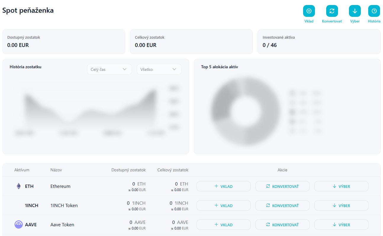 Sekcia Spot peňaženka slúži ako váš osobný finančný uzol, kde máte dokonalý prehľad o každom investovanom eure či cente. Horná časť prehľadne sumarizuje dostupné a celkové zostatky, zatiaľ čo vizuálne grafy histórie a alokácie aktív vám pomáhajú sledovať výkonnosť vášho portfólia v čase. Celé rozhranie je navrhnuté tak, aby ste mali dôležité ovládacie prvky pre správu majetku okamžite na dosah ruky bez zbytočného hľadania.