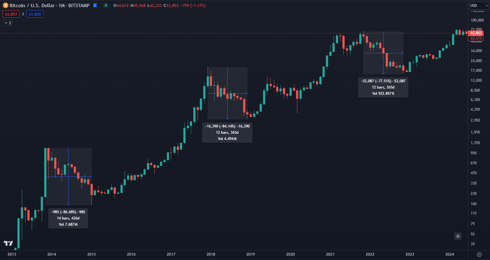 Po každom bullrune nastáva obdobie korekcie. A nemyslíme tým krátkodobú korekciu, ale dlhodobú. Aj počas bullrunu sa totiž vyskytujú korekcie, no tie majú väčšinou hĺbku do 30 % a trvajú mesiac. Dlhodobá korekcia však často znehodnotí trh kryptomien aj o viac ako 80 % a trvá vyše roka.