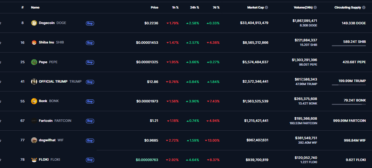 Najväčšie meme coiny na svete. Zdroj: coinmarketcap.com