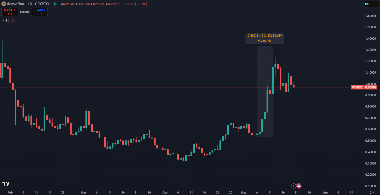 Podľa údajov TradingView PEPE nedávno dosiahol zhodnotenie za jediný týždeň o 104 %, WIF o 151 %, FLOKI o 74 %, DOGE o 57 % a takto by sme mohli pokračovať aj ďalej.