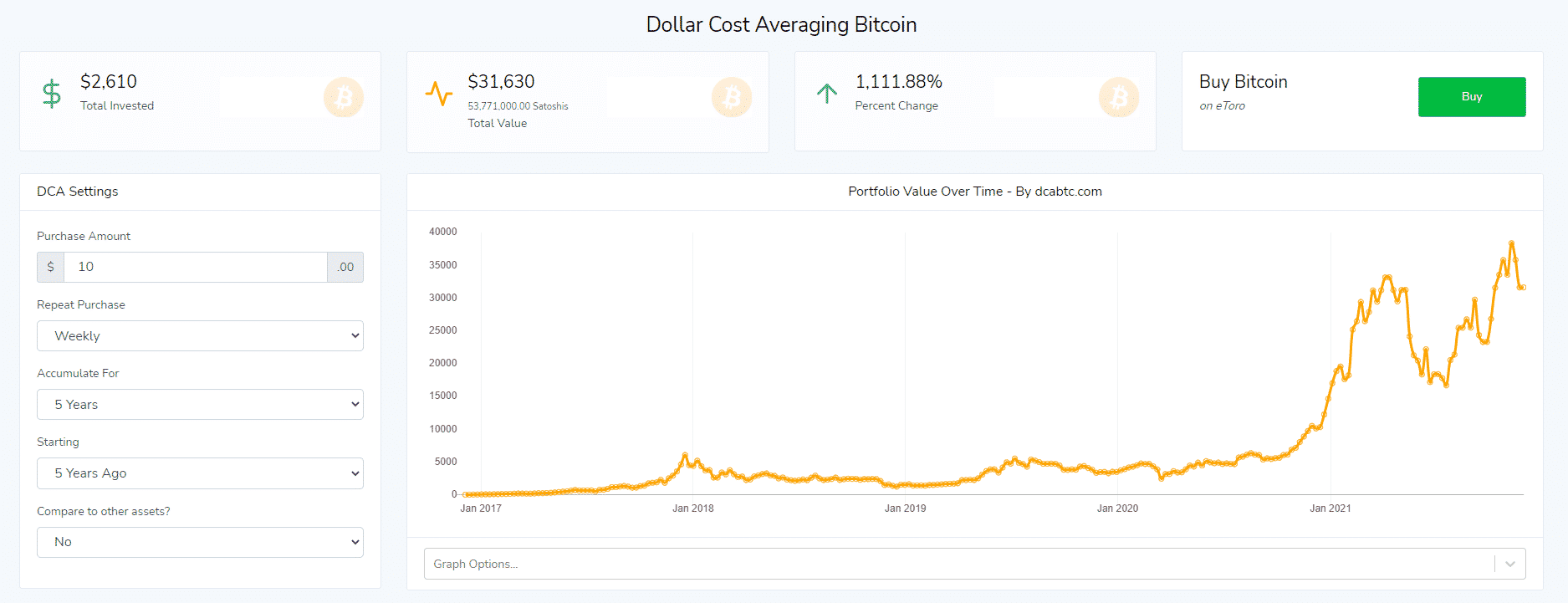Stanovili sme si týždenný nákup na pravidelnej báze na 10 USD. Nakupovať sa prvýkrát začalo pred 5 rokmi a posledný nákup bol tento týždeň. Celková zainvestovaná suma bola 2 610 USD. Aktuálna hodnota portfólia je niečo nad 30 000 dolárov. Celkový zisk je teda viac ako 1 100 %. Treba ale ešte raz na záver tohto článku pripomenúť, že zhodnotenie z minulosti nie je zárukou zhodnocovania v budúcnosti.