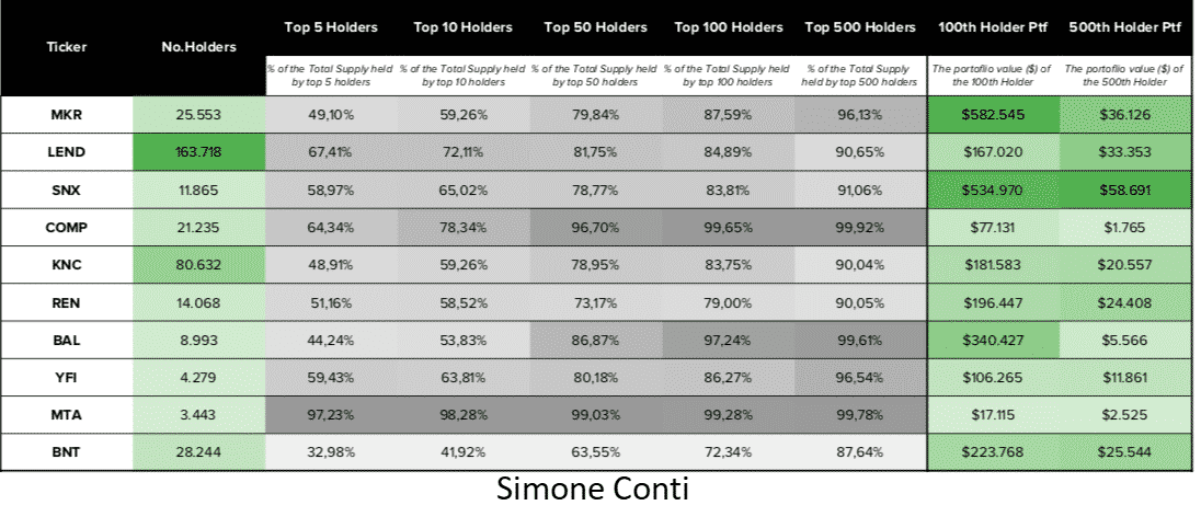 DeFi mánia pokračuje a kapitalizácia tohto trhu denne vytvára nové rekordy. Aktuálne je už v DeFi projektoch 76,5 miliardy dolárov. Podľa najnovšej analýzy ktorú nedávno zverejnil zakladateľ DeFi Italy Simone Conti však drvivú väčšinu tokenov troch najväčších projektov vlastní 500 veľkých investorov. O nejakej masívnej decentralizácii teda nemôže byť ani reči.