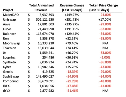 Ako ukazuje graf vyššie, za posledných 30 dní prudko vzrástli príjmy hlavných protokolov DeFi. Cena podkladových tokenov DeFi sa napriek tomu prepadla z 20% na 82%. Napríklad Maker poklesol za posledných 30 dní o 24%, ale v rovnakom období zaznamenal nárast výnosov o 449%.